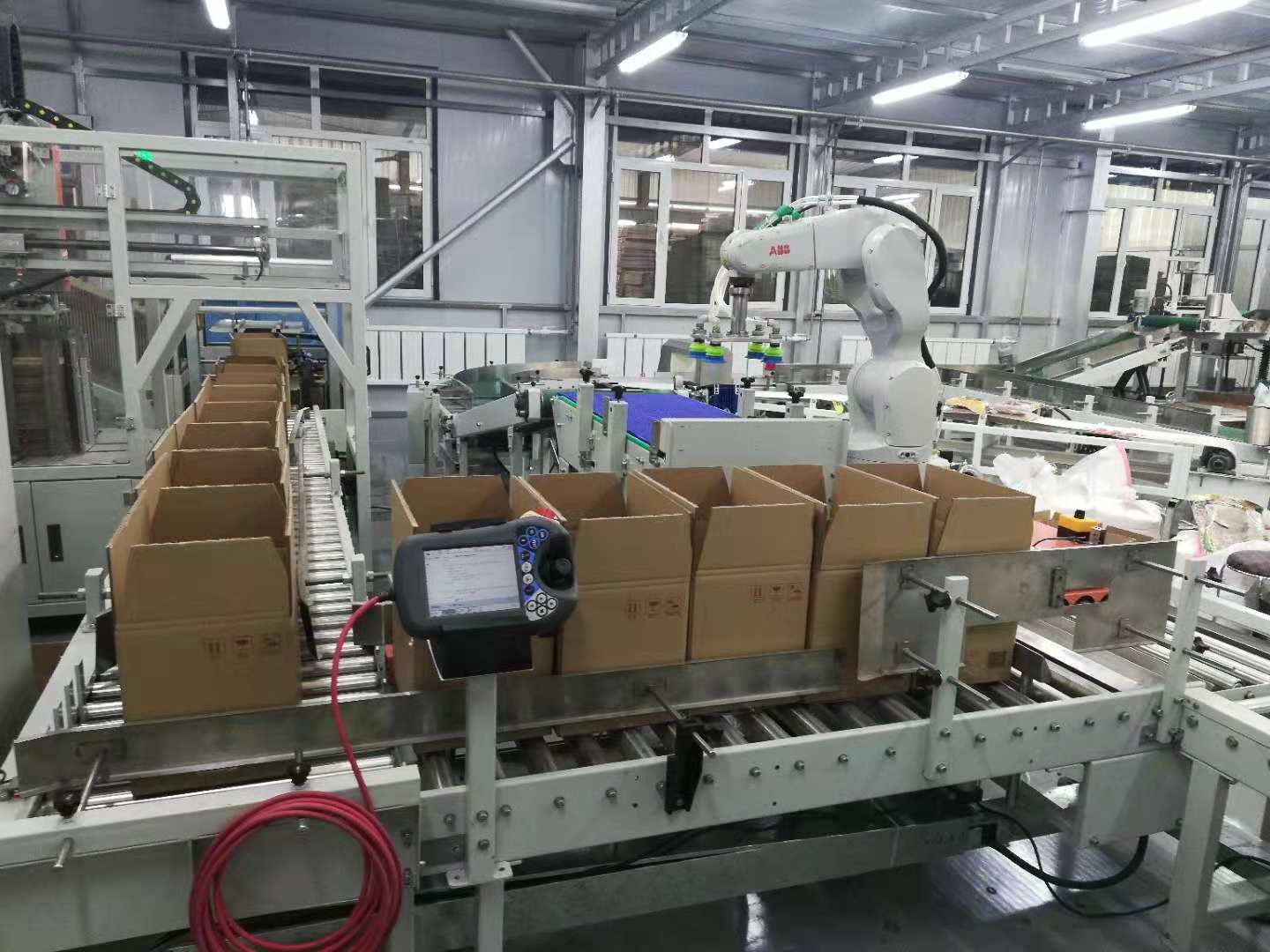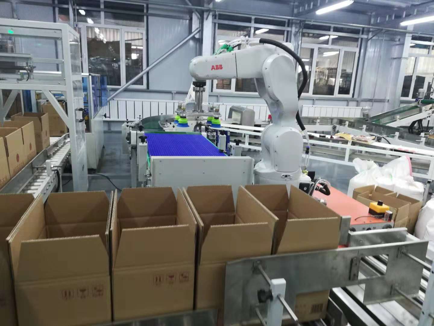 將產(chǎn)品通過進(jìn)料輸送帶輸送進(jìn)料,機(jī)器人及夾具到產(chǎn)品上方,抓取產(chǎn)品后移動到裝箱位,按事先輸入的裝箱形式進(jìn)行產(chǎn)品裝箱。