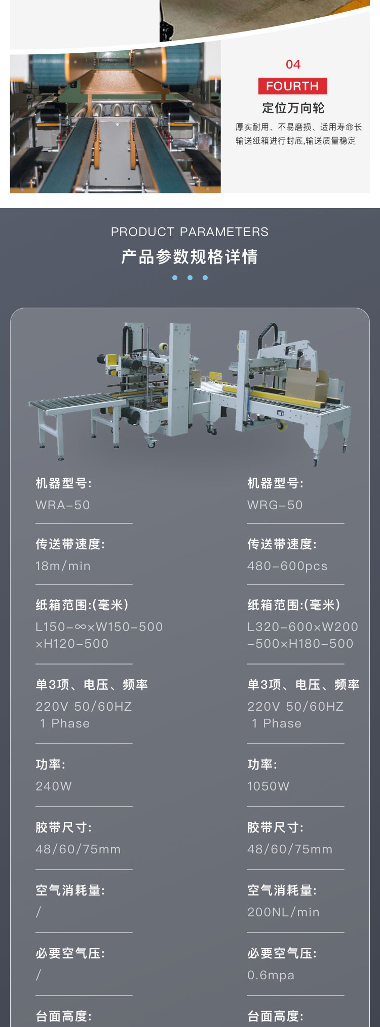 介紹:自動四角邊封箱機WRA-50-WRG-50工型封箱機的成功研發(fā),填補了封箱機在面對特別行業(yè)需進行角邊封箱空缺特別是針對與電子產業(yè)和需走海運的行業(yè),90°轉角機,氣缸自動推箱;紙箱上下四個角邊同時自動封箱,可與GPA/GPB/GPC機型聯機組合完成工字型封箱機。該款封箱機廣泛應用于食品、日化、電子等行業(yè)。 產品別稱:全自動封箱機、工字封箱機、一字封箱機、十字封箱機、四角邊封箱機、上下驅動封箱機、左右驅動封箱機、快遞封箱機、電商封箱機、膠帶封箱機、快速封箱機、可調封箱機、伺服封箱機
