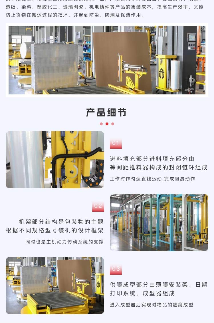 介紹:為適應(yīng)貨物集裝化儲(chǔ)存、運(yùn)輸及機(jī)械化裝卸作業(yè)的包裝要求,設(shè)計(jì)制造了托盤(pán)式、圧頂式、阻拉型、預(yù)拉型自動(dòng)薄膜纏繞系列產(chǎn)品,廣泛適用于外貿(mào)出口、食品飲料、制罐、造紙、染料、塑膠化工、玻璃陶瓷、機(jī)電鑄件等產(chǎn)品的集裝成本,提高生產(chǎn)效率,又能防止貨物在搬運(yùn)過(guò)程的損壞,并起到防塵、防潮及保潔作用。 適用于快速運(yùn)輸或儲(chǔ)存; 適應(yīng)性強(qiáng),低耗,減輕勞動(dòng)強(qiáng)度; 對(duì)包裝物能起到防塵、防潮、保潔的作用; 減少包裝物的表面擦傷,提高表面質(zhì)量,使包裝更牢固.
