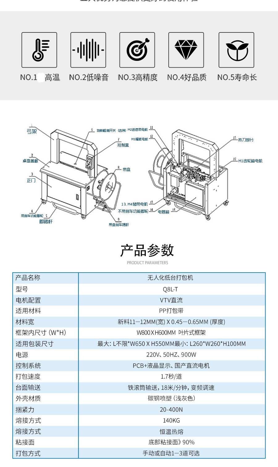 介紹:電機(jī)+減速機(jī)+凸輪+緊縮臂運(yùn)作,捆緊力大,故障少,維修方便。 零部件均由電腦微控機(jī)床精密加工,機(jī)械動(dòng)作柔和穩(wěn)定,耐久性,功能齊全,使用壽命長(zhǎng)。 捆包結(jié)束后電機(jī)馬上停止運(yùn)轉(zhuǎn),省電實(shí)用。 保養(yǎng)容易,免加油,機(jī)械堅(jiān)固,操作簡(jiǎn)單。 用途廣泛,可單機(jī)操作或配合其他機(jī)種,設(shè)計(jì)自動(dòng)化與無人化的生產(chǎn)系統(tǒng)。 外型精巧、美觀、節(jié)省空間。 側(cè)式設(shè)計(jì)可避免機(jī)器接觸到水或其它污染物 打包機(jī)不脫帶,自動(dòng)送帶 ?