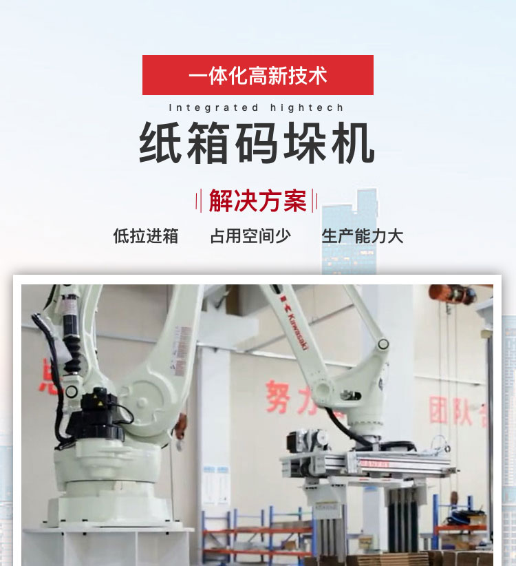介紹:頂升抓取機(jī)構(gòu)帶有置中、疊包功能,可配合前疊包平衡碼垛效率;專業(yè)設(shè)計的紙板夾具帶有鉤,可夾取放置一層或兩層紙箱防掉落;機(jī)器人采用四軸式Kawasaki機(jī)械手臂兼顧性能與成本,將紙箱按自定義的垛型自動碼放到托盤上。 產(chǎn)品別稱:紙箱碼垛機(jī)械手、自動流水線紙箱碼垛機(jī)、紙箱碼垛、機(jī)器人紙箱碼垛、紙箱碼垛機(jī)器人