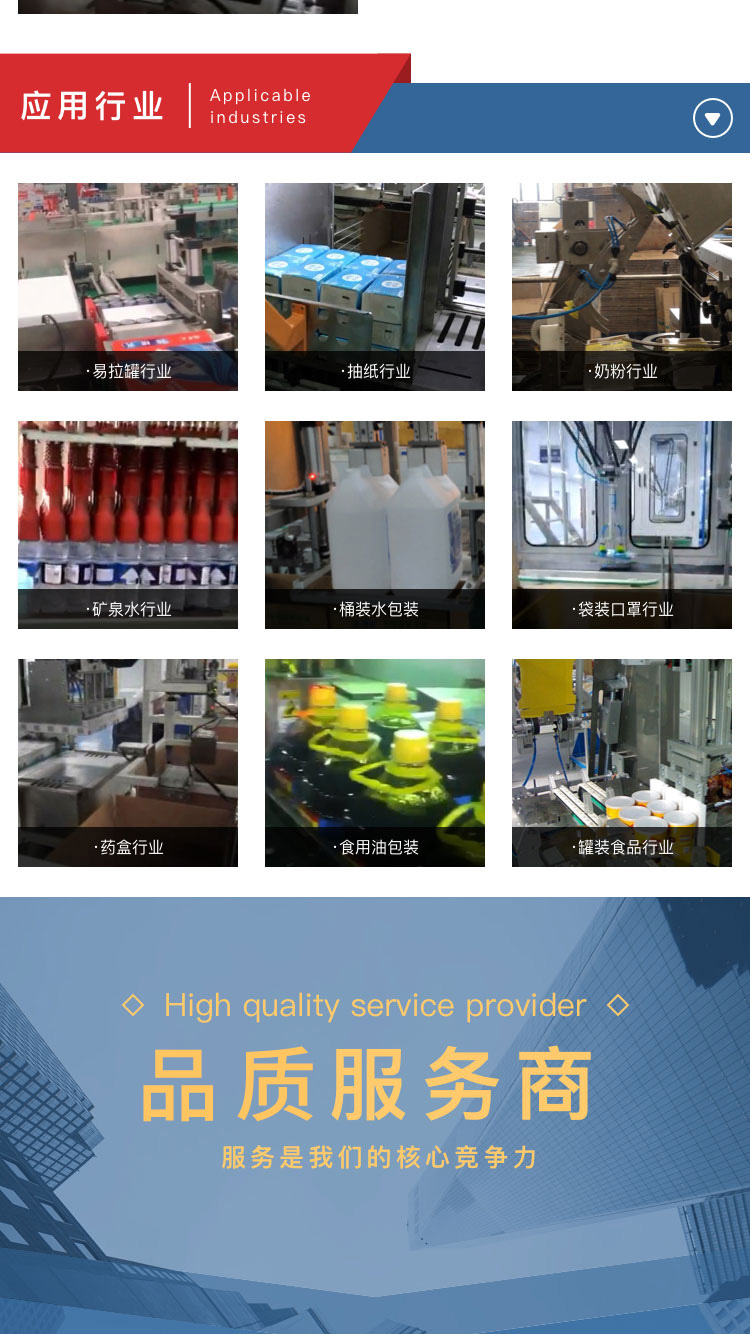 介紹:裝箱機是包裝機械的一種,有自動箱盒機、裝箱機等. 自動裝箱機是將藥瓶、藥板、藥膏等和說明書自動裝入折 疊紙盒中,并完成蓋盒動作。大屏幕可視面板獨立式按鈕七寸彩屏界面,簡單快捷,操作易懂單獨的按鈕設(shè)計,操作更簡單側(cè)推裝置結(jié)構(gòu)緊湊合理電器元件采用國內(nèi)品牌,性能穩(wěn)定將對疊好的抽紙推到箱子里。 專注后道包裝設(shè)備性能穩(wěn)定鑄就匠心品質(zhì),精工制造、支持訂制。 產(chǎn)品別稱:裝箱機、裝盒機、自動裝箱機、自動裝盒機、跌落式裝箱機、側(cè)推式裝箱機、抓舉式裝箱機、機器人裝箱機、一片式裹包機、藥盒裝箱。