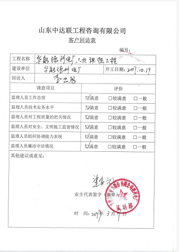 云南華電鎮(zhèn)雄電廠超低排放改造項目客戶回訪表