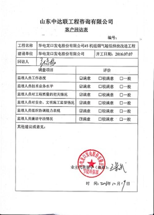 龍口電廠#3機(jī)組超低排放項(xiàng)目回訪表