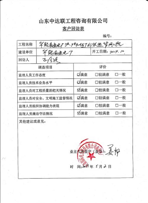 云南華電鎮(zhèn)雄電廠超低排放改造項(xiàng)目客戶回訪表